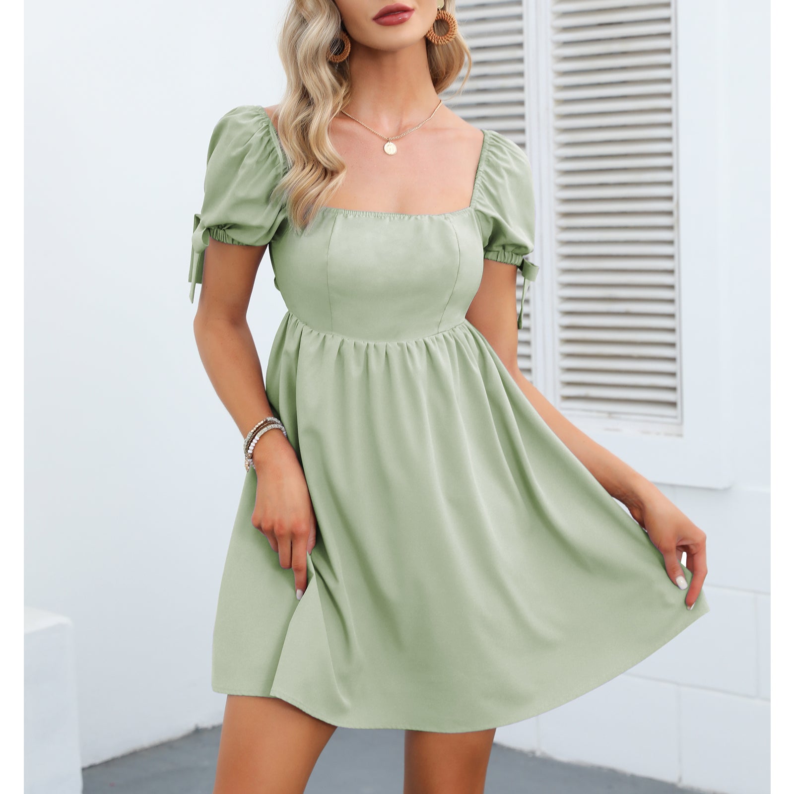 Design: backless, square neck, tie back, bowknot, tie knot cuff, high waist, a-line silhouette, short puff sleeve, lining, cut out, mini length, solid color, cut out, babydoll dress.